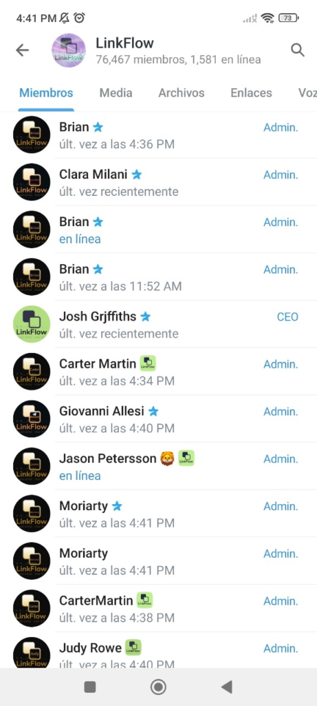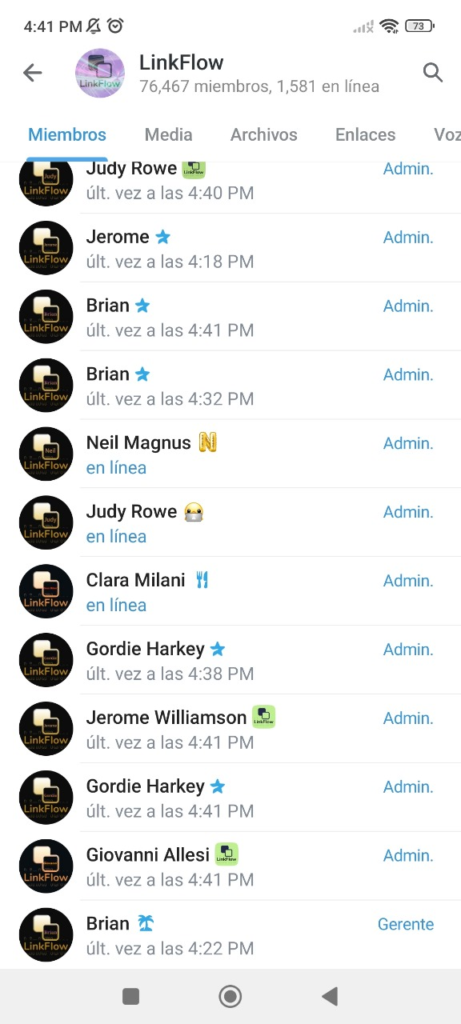 No contentos con desaparecer el dinero de miles de peruanos Link Flow se contactaba con sus “trabajadores” a través de grupos de Telegram donde presentándose como gerentes actuaban bajo los nombres de variados personajes, por ejemplo, el «CEO de Link Flow» se hace llamar «Josh Griffiths» que es el nombre de un conocido futbolista inglés. Pero la lista no queda ahí, en ella podemos observar otros curiosos nombres, como el de un cura que fue acusado de violación en 1970 “Neil Magnus” cuyo nombre es mencionado en el documental «The Keepers» de la plataforma Netflix, otro nombre que usaron “Carter Martin” que invertido es el nombre de un reconocido poeta guyanés, ”Jason Peterson” nombre de un reconocido magnate norteamericano, hasta el nombre “Moriarty” que es un Villano de ciencia ficción en la saga de libros Sherlock Holmes, entre otros, ¡Increíble!