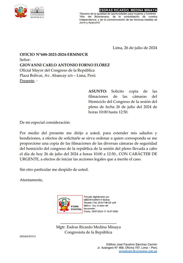 “Por medio del presente me dirijo a usted (…) a efectos de ordenar a quien corresponda se me proporcione una copia de las filmaciones de diversas cámaras de seguridad del Hemiciclo de la sesión del Pleno llevada a cabo hoy 26 de julio a horas 10:00 a 12:50, con carácter de urgencia, a efectos de iniciar las acciones legales que amerite el caso”, dice el documento.